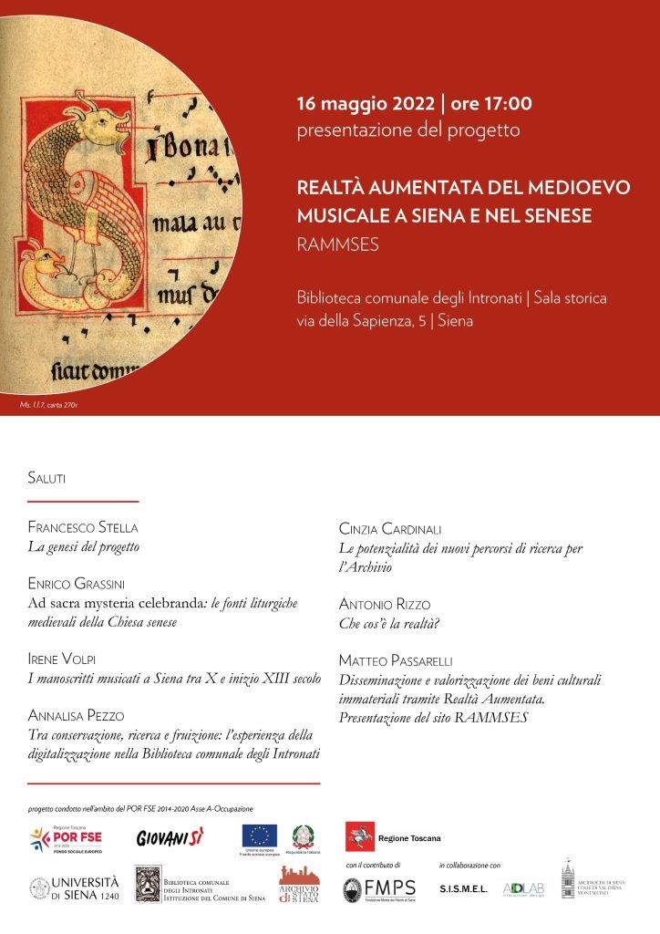L’iniziativa Lunedì 16 maggio alle ore 17:00, presso la Sala storica della Biblioteca comunale degli Intronati, sarà presentato il progetto Realtà Aumentata del Medioevo Musicale a Siena e nel Senese (Rammses), importante ricerca dell’Università degli Studi di Siena in partnership con la Biblioteca e l’Archivio di Stato di Siena, realizzata con il finanziamento della Regione Toscana, attraverso il Programma operativo regionale (Por) del Fondo sociale europeo (Fse) 2014-2020, e della Fondazione Mps.